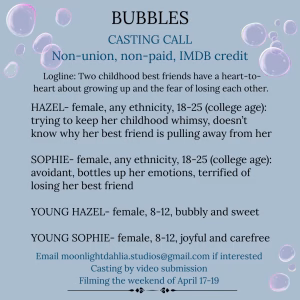 A student film production is casting actors for the short film Bubbles.