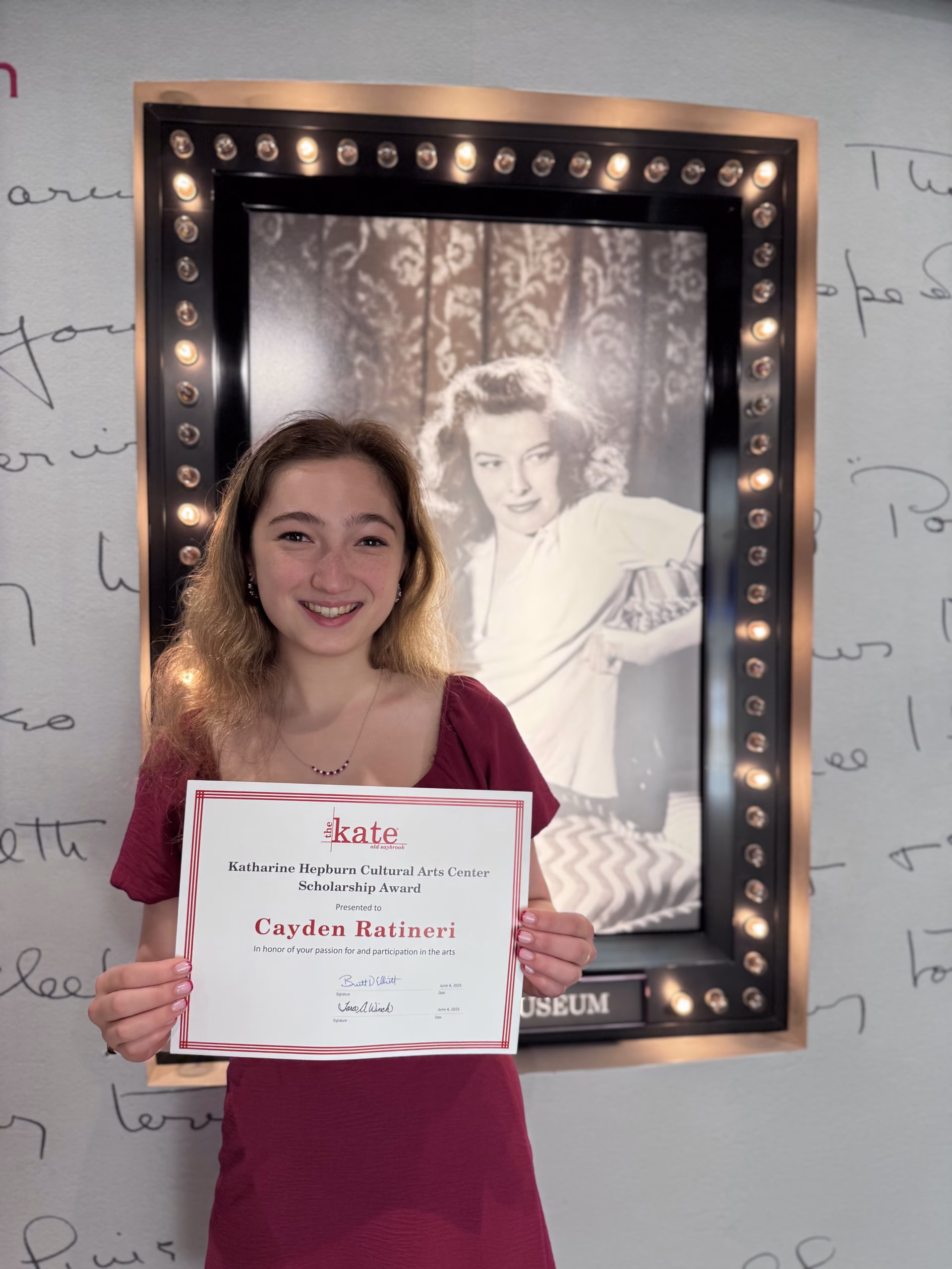 Salve Regina University (Newport, RI) Honors program, CT All-State Soprano, All-region Soprano. 3rd Degree Black Belt in Tang Soo Do, American Idol “Front of the Line” Contestant (‘24 & ‘25), Veronica in “Un$uited.” Background in Rise & Fall (Amazon, not yet released), Doritos Spec Commercial 2024 for Superbowl 2025, Theater since 6th Grade, International Thespian Society Member, National Honor Society Inductee, Small Business Entrepreneur (Cayden’s Creations), Passionate HS Theater Participant, Featured Vocalist for Wreaths Across America, the Connecticut Hero Tree Lighting Ceremony & The New England Tang Soo Do Championships. Carolyn Greenleaf Award Winner - vocals.