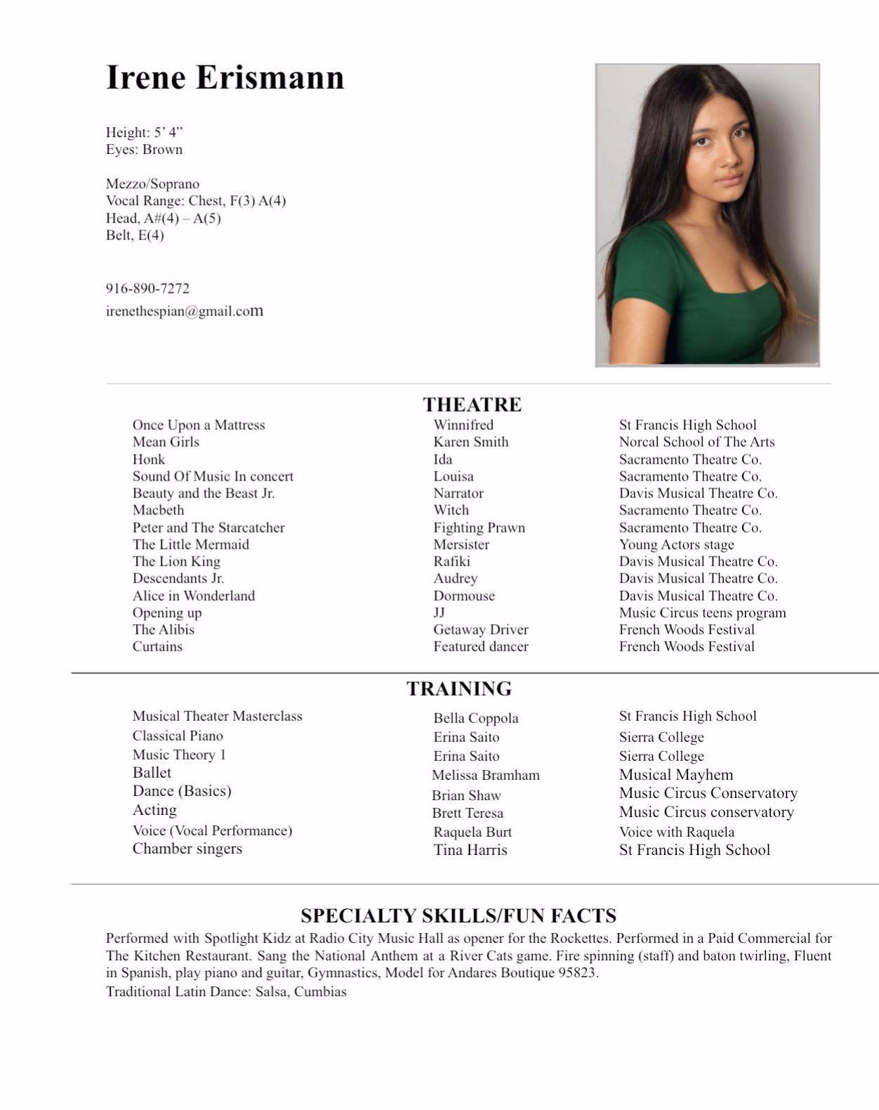 Irene is a versatile actress. Her highlight has been opening the Radio city Rockettes as a singer. She is good at communication and carries herself professionally in all projects she does.