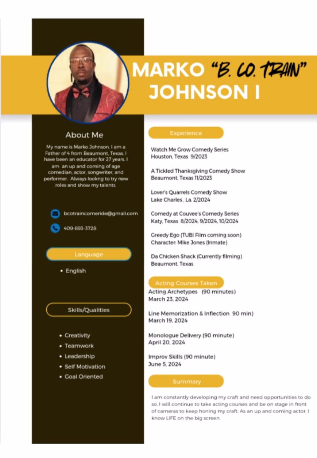 Hello. My name is Marko Johnson. I am a retired engineering and robotics teacher, coach, softball umpire, basketball referee, and most importantly father of 4 children. I am a songwriter, actor, comedian, and team player. I have reels that I will share as soon as the films premier. On my resume, there are 5 recent projects that are not on there. Please contact me at [email protected] for more information.
