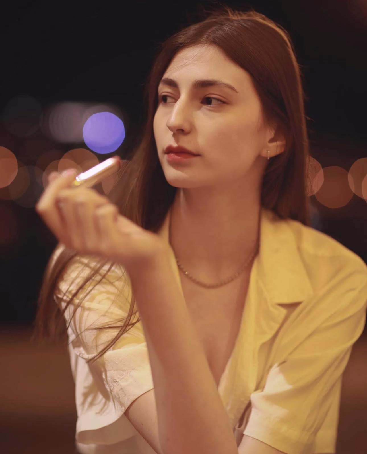 Slim, 174 cm tall, long hair with light brown color, hazel eyes, clear skin.